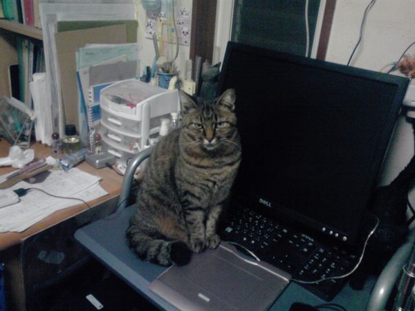 あんまり普段テーブルの上に乗らない猫なんだけど、今日は犬がよほどうざかったのかパソコン台の上に。